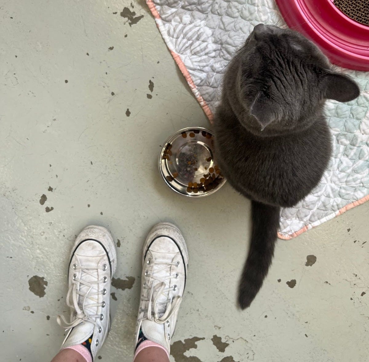 She likes this litter. She eats at this time. She likes to be pet like this. Sure. She follows me around the house. She’s nearby before I wake up. It’s time to hang out.